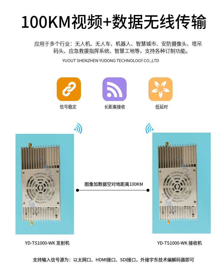 YD-TS1000-WK 是應(yīng)用于無人機(jī)行業(yè)的圖數(shù)控一體化超遠(yuǎn)距離無線傳輸設(shè)備(最遠(yuǎn)可達(dá) 15至20 公里),具有體積小、功耗低、通信距離遠(yuǎn)等特點(diǎn),支持高清視頻、飛控?cái)?shù)據(jù)、云臺(tái)控制數(shù)據(jù)、遙控器控制數(shù)據(jù)等同時(shí)傳輸。